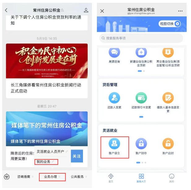 登錄“常州住房公積金”微信公眾號后,進入“業(yè)務辦理”→“我的業(yè)務”→“靈活就業(yè)”→“賬戶設立”界面,自助辦理申請手續(xù)。