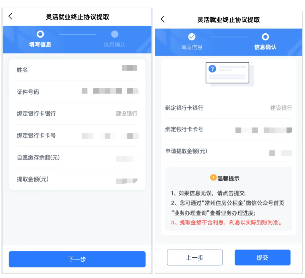 步驟2:銀行卡綁定成功后,確認基本信息,點擊“下一步”,確認綁定銀行、銀行卡號、提取金額后,點擊“提交”按鈕,業(yè)務辦理成功。