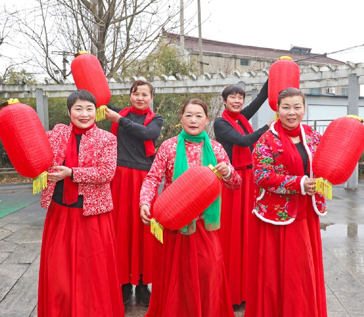 前黃鎮(zhèn)坊東村健身廣場(chǎng),跳廣場(chǎng)舞的阿姨們正展示著新購(gòu)置的燈籠,紅紅火火鬧新春。
