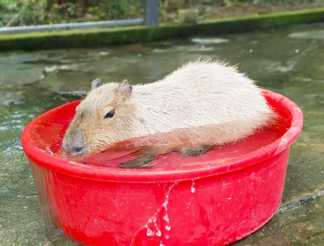 熊貓館內(nèi)涼意十足,24小時(shí)運(yùn)轉(zhuǎn)的制冰機(jī)與兩臺(tái)5匹風(fēng)管機(jī)構(gòu)成“清涼站”。冰塊基座上,蘋果片、胡蘿卜與特制窩窩頭錯(cuò)落擺放,大熊貓對(duì)著“水果冰山”大快朵頤。紅熊貓們則在陰涼處開啟“慵懶模式”,有的趴在木架上啃冰鎮(zhèn)水果,有的用爪子撥弄噴淋水霧,還有的在“荷葉床”上打滾,惹得游客笑聲連連。河馬池里上演著“夏日狂歡”,西瓜剛被拋入水中,就被河馬一口吞下半個(gè),汁水飛濺如“水下核彈”。水豚們則是“佛系”消暑,它們泡在澡盆里,淡定咀嚼著漂浮的蘿卜塊與蔬菜葉,冰塊上擺成荷花造型的零食更添雅趣。
