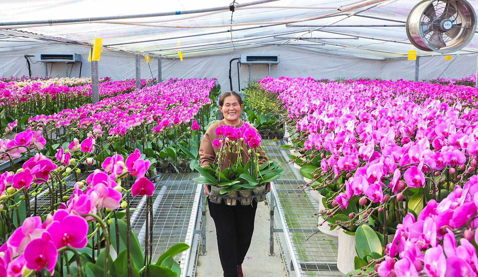 隔壁的世華花卉種植基地種植有40多種不同品類的蝴蝶蘭,“品質(zhì)好不愁賣,我們所有工作人員都在大棚里加班加點(diǎn)工作,現(xiàn)在還有幾個(gè)訂單只能往下月排了。”該基地負(fù)責(zé)人李偉說,過去年宵花給人的印象是“論斤賣”“論盆賣”,現(xiàn)在實(shí)現(xiàn)了“論株賣”,今年他培育出了蝴蝶蘭中的名貴品種“熊貓”,一株的批發(fā)價(jià)可達(dá)50元左右。