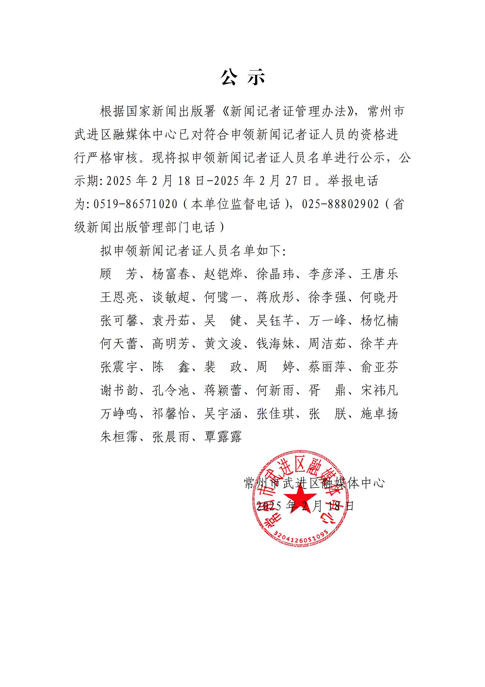 常州市武進(jìn)區(qū)融媒體中心擬申領(lǐng)新聞?dòng)浾咦C人員名單公示