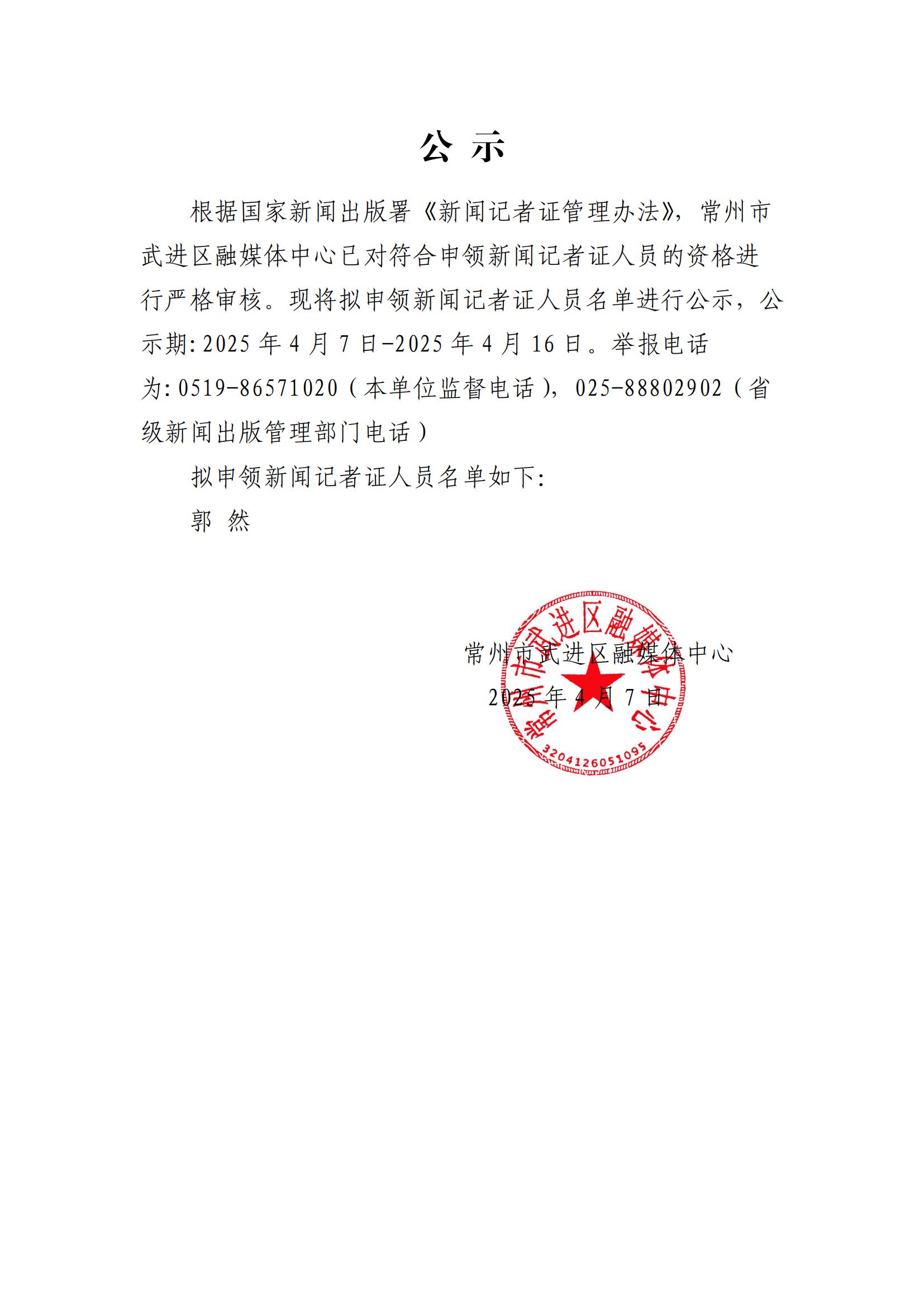 常州市武進區(qū)融媒體中心擬申領(lǐng)新聞記者證人員名單公示