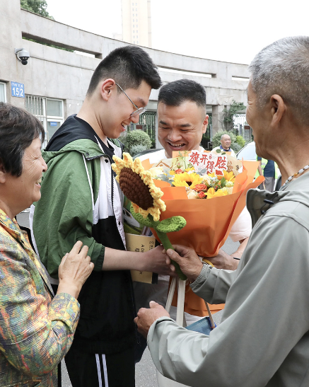 考生們走出校門,迎接他們的是鮮花和擁抱;接過寓意“一舉奪魁”的向日葵花束,他們臉上是滿懷憧憬和興奮的笑容。省前中高三(13)班的金秒告訴記者,要利用假期做一些之前因?yàn)閷W(xué)習(xí)暫時(shí)擱置的事,“想出去好好玩一趟,學(xué)畫畫、考駕照,為即將到來的大學(xué)生活做好準(zhǔn)備。”