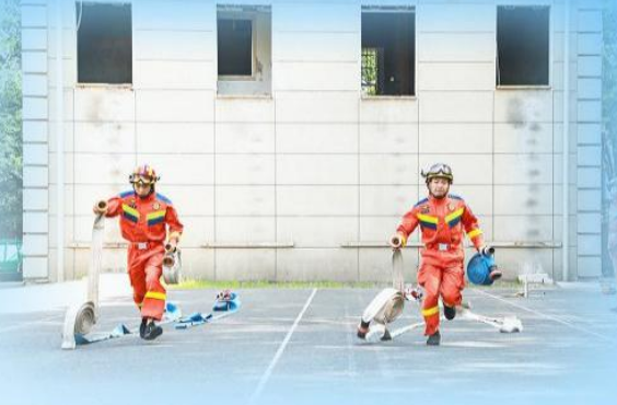 區(qū)消防救援大隊(duì)消防員在烈日下訓(xùn)練。徐晶瑋 攝