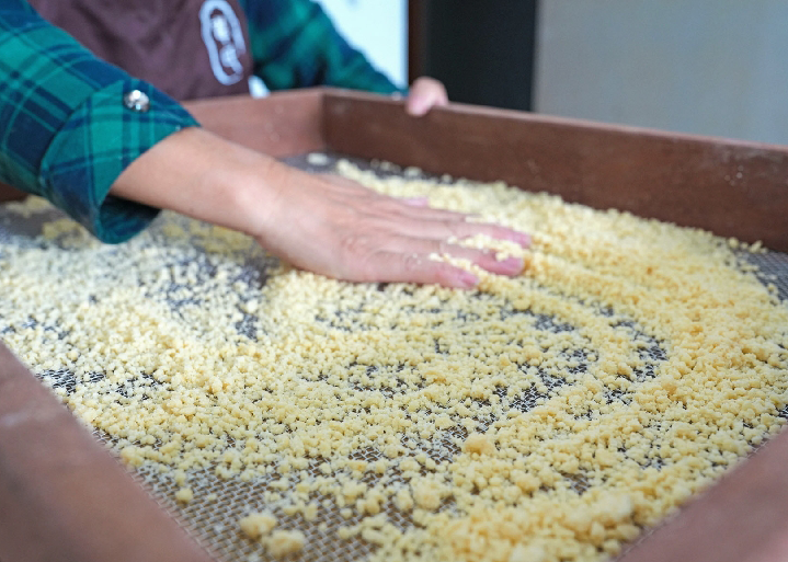 “原材料用的是自家田里種的南瓜、黑芝麻,健康無添加。”韋夏英說,常州傳統(tǒng)的重陽糕以甜口為主,圓形寓意團(tuán)圓美滿。她在傳統(tǒng)基礎(chǔ)上不斷調(diào)整配比與餡料,反復(fù)推敲糖度與油度的黃金配比。今年推出的四色拼盤重陽糕,紅豆綿密、南瓜清甜、紫薯醇厚、黑芝麻香濃,四色交融,成為食客爭相追捧的爆款。為應(yīng)對訂單激增,她每日凌晨便踏入作坊,一站便是十幾小時(shí),親手篩選上百斤米粉,確保每一粒都細(xì)如發(fā)絲、均勻無瑕。