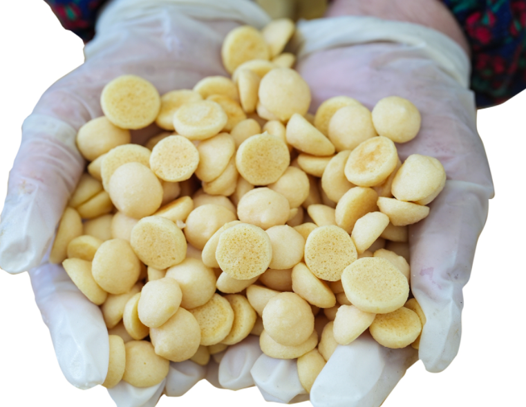 豆炙餅的制作原料僅有豆子與水,看似簡單,實則每一步都藏著門道。“傳統(tǒng)用的白雀豇豆如今已少見,我們換成了豌豆和蠶豆配比。”朱川茍介紹,新配方省去了剝皮工序,將老味道牢牢保留。豆子經煮熟、打漿、攪拌后入料,滿滿一盆豆?jié){需兩人合力端起,緩緩倒入定制機器,特制模具順勢擠出一排小圓餅,醇厚的豆香瞬間溢滿整間屋子。“以前我母親純手工做,一天只能出三四公斤;我接手后也不過幾十公斤,現在有了機器,一天做三四百公斤不成問題。”朱川茍談及手藝的變遷,滿是感慨。