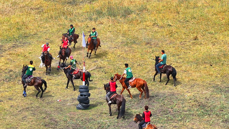 本屆運動會設(shè)置了多項富有民族特色的傳統(tǒng)體育項目,姑娘追表演、馬背拾銀、叼羊預(yù)決賽等傳統(tǒng)賽事既有趣又精彩,騎手們策馬揚鞭、身手矯健,展現(xiàn)出精湛的騎術(shù)和無畏的勇氣,贏得了現(xiàn)場觀眾的熱烈喝彩。“叼羊比賽,還有哈薩克族姑娘追等馬上項目,讓我領(lǐng)略到了草原上風(fēng)土人情,非常精彩。”伊寧游客 孜拉來·買買提明說。