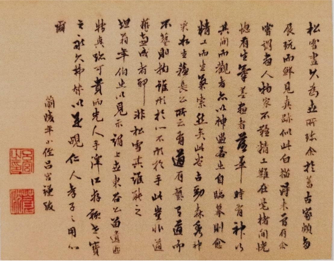 松雪畫久為世所珍,余于蓄古家頗多展玩而鮮見真跡,似此白描,得未曾有。余嘗謂畫人物家,不難精工,難在毫楮間恍惚有生暈差,畫者落筆時有神似其間而觀者亦以神遇,若出自臨摩,則愈精工而生氣索然矣。此卷古勁森秀,神采如生。蘇長公所云“有道有藝,有道而不藝,則物雖形于心,不形于手”,此豈非道藝畫成者耶?非松雪其誰能之。坦翁年伯出以見示,謂上世東谷公留遺,匪特真跡可貴,而先人手澤以存,厥世世寶之,永久弗替,以是覘仁人孝子之用心爾。