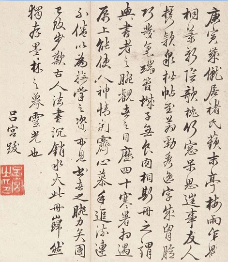 這是一段書寫于順治七年的跋文,也是目前可見的呂宮最早的書法作品。韓道亨是明末書法家,工書法,其楷、行、草書俱佳。從跋文中可以看出,呂宮對韓道亨很是尊崇,對其所書唐詩一函四冊能歷經(jīng)明清鼎革之亂而幸存于世倍感欣慰。題跋用墨和潤、筆力精健,布局疏朗和諧,瀟灑秀逸之氣躍然紙上。