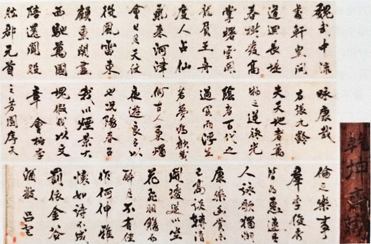長卷的后半部分,書寫的《春夜宴從弟桃李園序》,其中詩序部分以清新俊逸的文字、轉(zhuǎn)折自如的筆調(diào),表現(xiàn)了歡快的天倫之樂和濃濃的兄弟之情。而將張、李二人之作聯(lián)合起來進行審視,那么呂宮書寫這幅長卷背后的精神世界,也就很自然地鋪展在世人眼前,那就是:廟堂雖好,不是久戀之鄉(xiāng);故園雖陋,卻是心安之地。