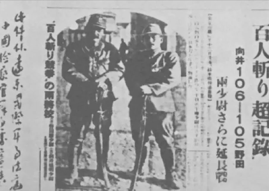 ▲《東京日日新聞》關(guān)于“百人斬”殺人比賽的兩個劊子手野田毅(右)、向井敏明(左)的新聞報道。據(jù)日軍1937年11月29日日志載:“武進(jìn)是抗日、排日的根據(jù)地,所有街道都進(jìn)行掃蕩,不問老幼男女,全都槍殺。”據(jù)11月30日、12月6日和12月13日的日本《東京日日新聞》《大阪每日新聞》《大阪朝日新聞》等報道:十六師團(tuán)片桐部隊的兩個少尉向井敏明和野田毅,從無錫出發(fā),在經(jīng)過常州、丹陽、句容到南京的侵略途中,進(jìn)行“百人斬”殺人比賽。從無錫到常州,向井殺了59人,全是在橫林鎮(zhèn)和火車東站附近殺的;野田殺了25人,其中21人是在橫林鎮(zhèn)和火車東站殺的。