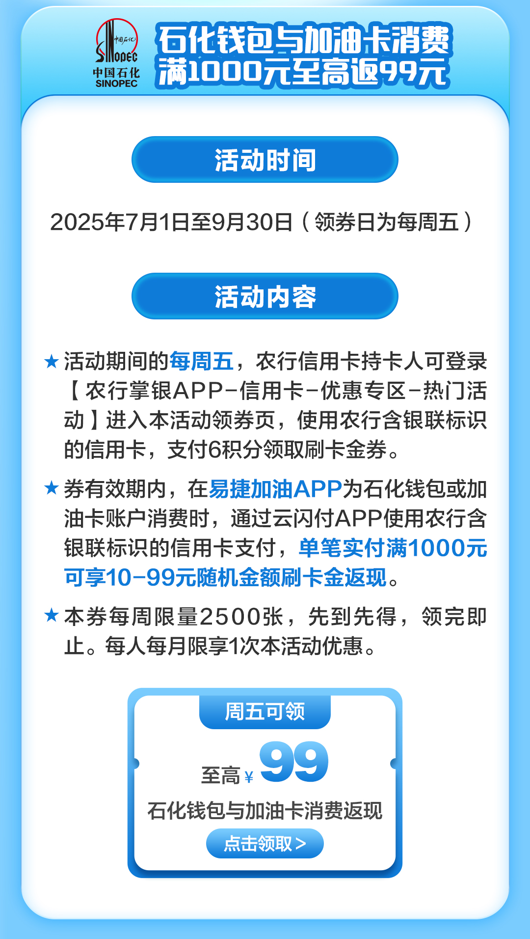 單筆至高優(yōu)惠99元,加油就用農(nóng)行信用卡!【W(wǎng)OW福利】