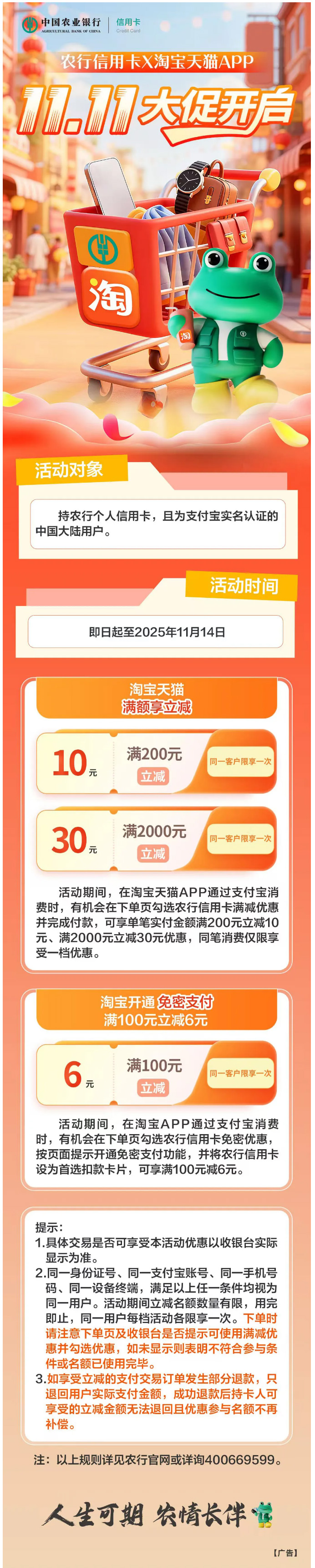 淘寶11.11大促開啟,農(nóng)行信用卡支付寶消費(fèi)享立減!【W(wǎng)OW福利】