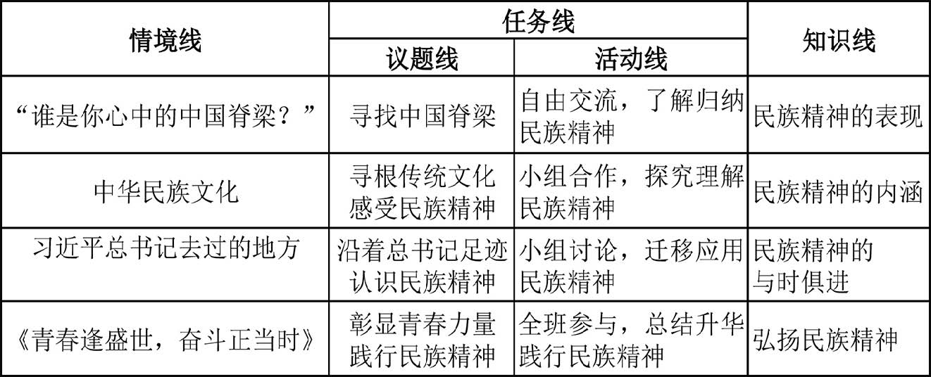 課堂是培養(yǎng)學(xué)生核心素養(yǎng)的重要場所,以議題為紐帶,打造素養(yǎng)課堂。核心素養(yǎng)目標為議題設(shè)計提供了根本遵循,我聚焦文化自信,根據(jù)課程標準、核心素養(yǎng)目標、學(xué)情等因素,從核心價值、學(xué)科素養(yǎng)、關(guān)鍵能力和必備知識的維度確立了“自覺成為弘揚民族精神的中國人、培育學(xué)生永遠跟黨走的政治認同、弘揚民族精神的責(zé)任擔(dān)當、培養(yǎng)獲取和解讀信息能力、理解民族精神的內(nèi)涵”等教學(xué)目標。